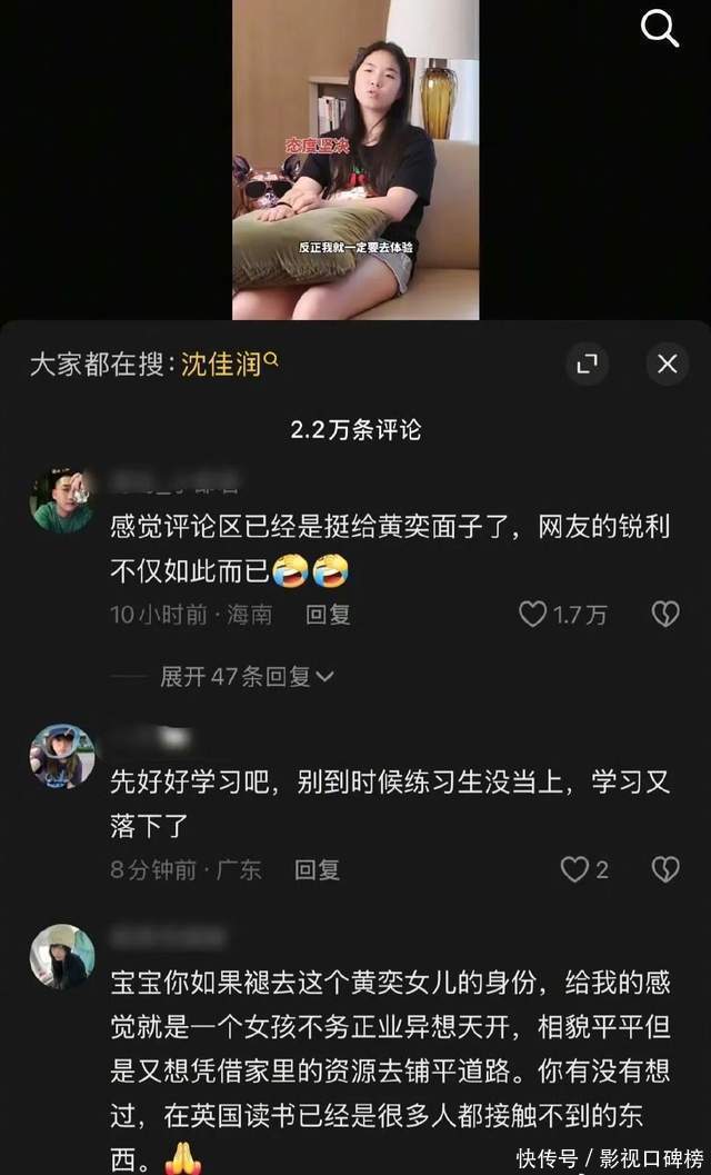 如果这只是孩子年龄小,对人间疾苦不清楚,后面她反问“你能当艺人,为啥我不行?”这句话才是引爆全网热议。这是因为看久了妈妈的脸,所以不知道她是个大美女吗?黄奕什么长相啊?当妈的不好意思说女儿不好看,网友可不留情啊,网上这两天疯传黄奕年轻时的神照,网友也不想过分打击12岁的小女孩,但也就差把事实说出口。