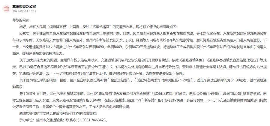 收到网友留言后,兰州市交通运输委高度重视,迅速对该问题进行了核实与回应。