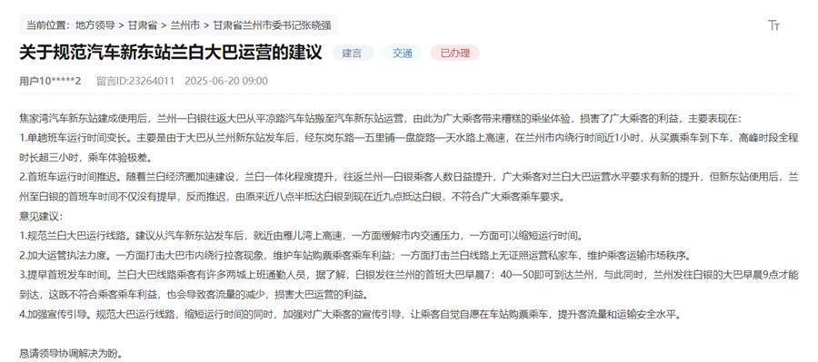 人民网兰州9月24日电 (记者米媛)近日,有甘肃网友通过人民网“领导留言板”反映,兰州至白银往返大巴自迁至焦家湾汽车新东站后,出现运行时间延长、首班发车时间推迟等问题,给跨城通勤乘客带来不便。该网友指出,大巴从新东站发车后需绕行市区近1小时,导致全程时间增加,高峰时段超过3小时,同时,首班车抵达白银时间近9点,无法满足通勤族需求。