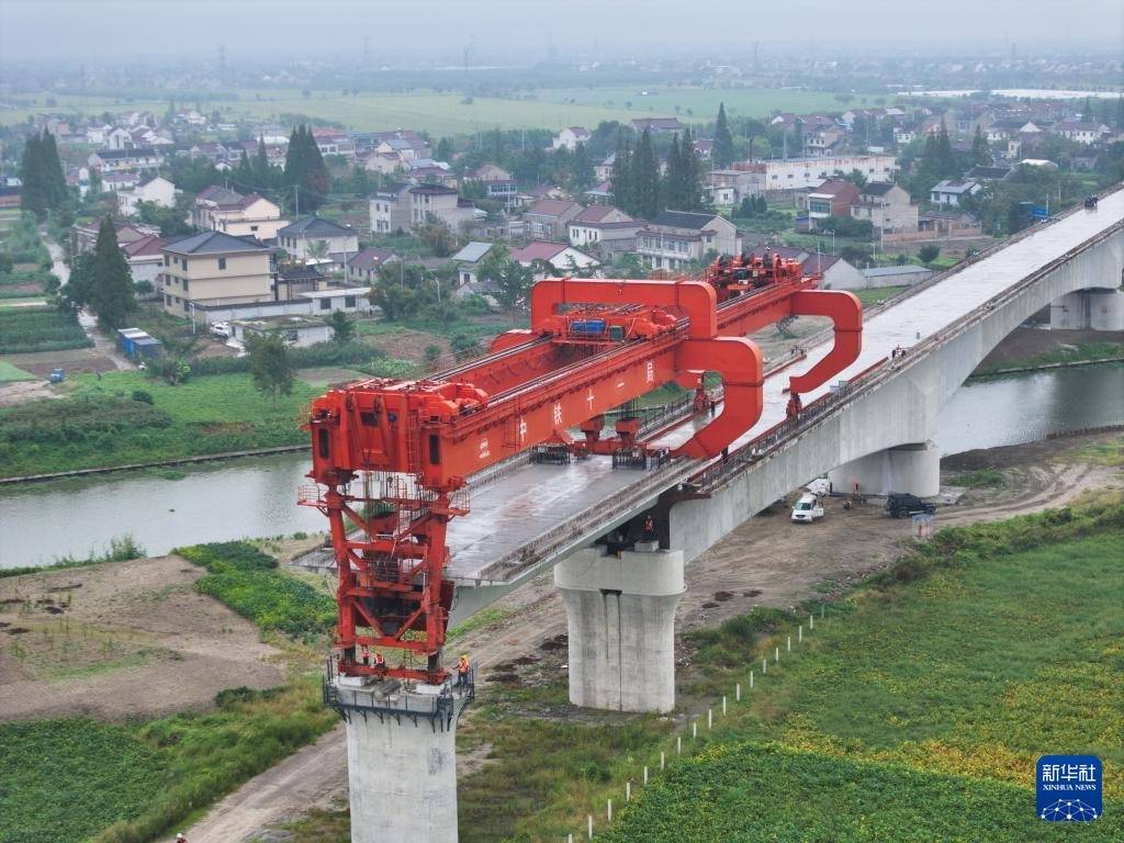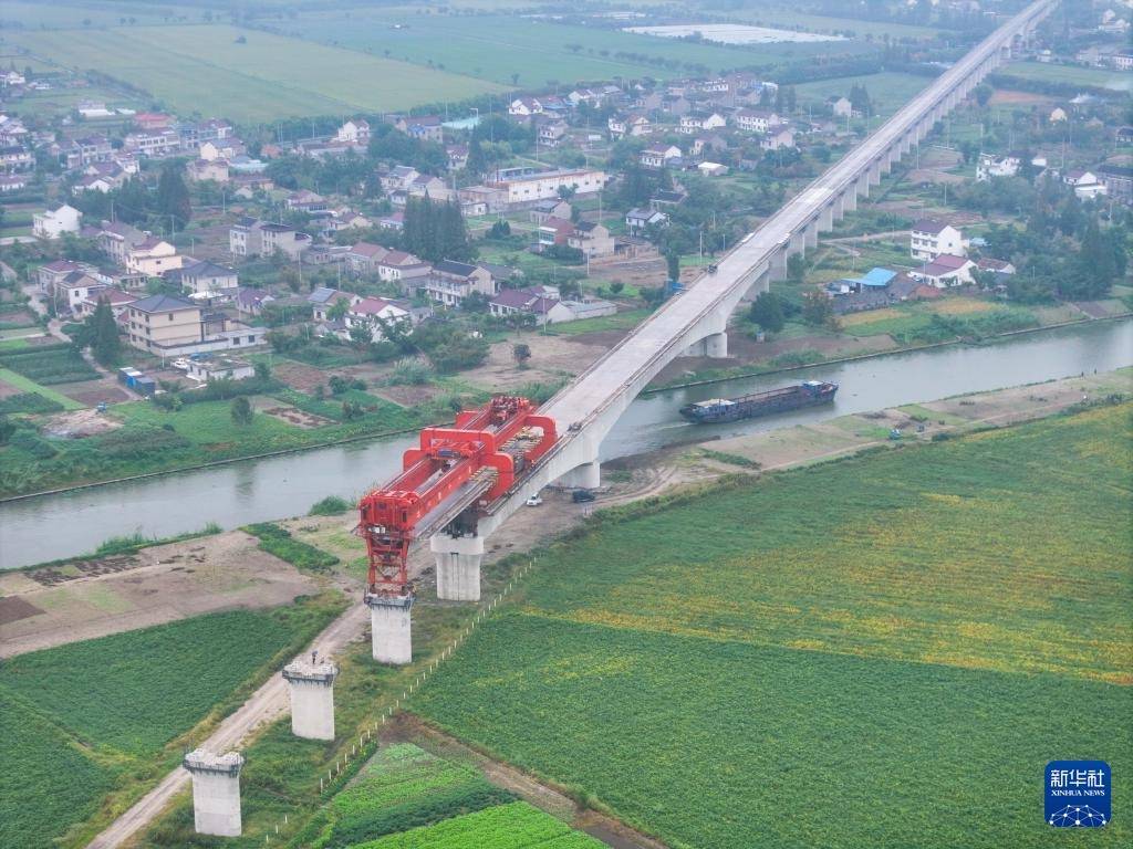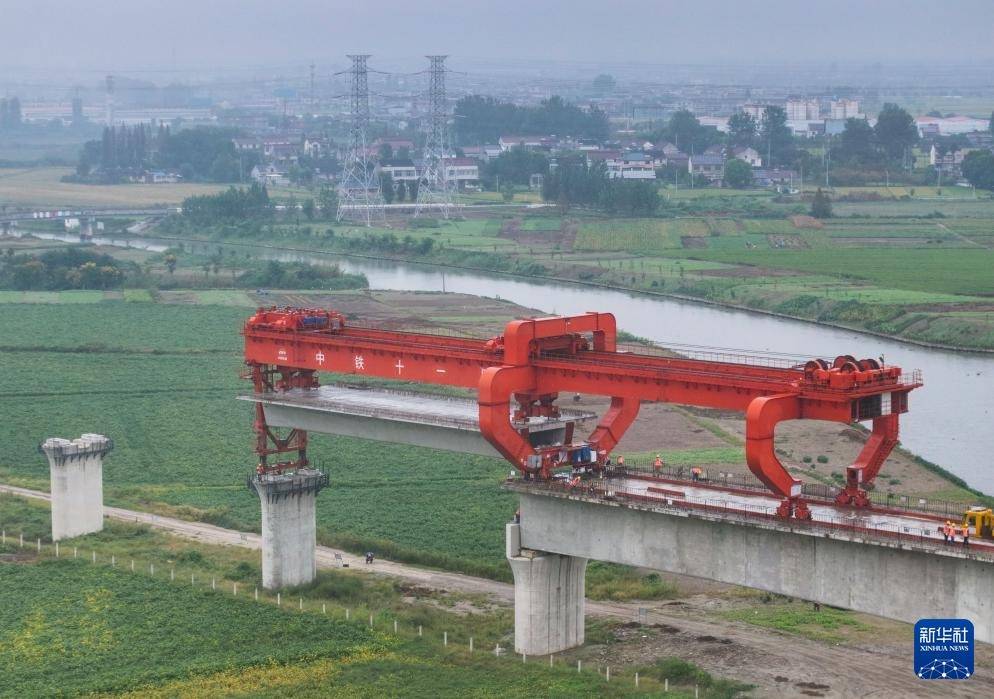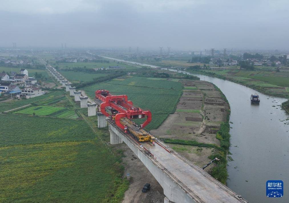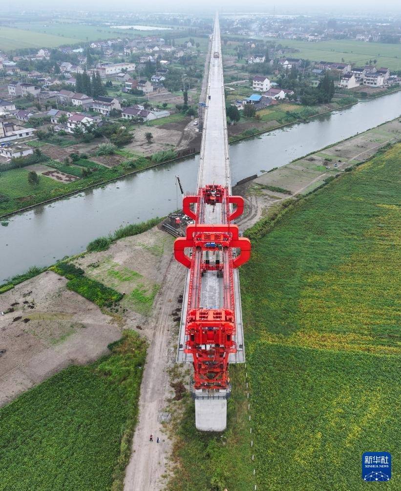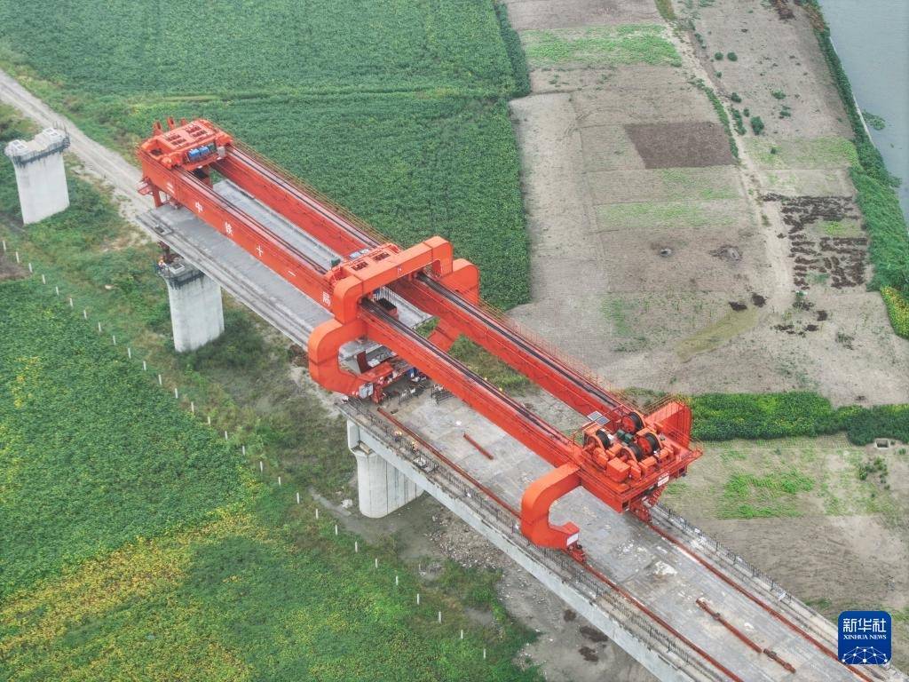 r中铁十一局新建沪宁合高铁沪宁段通泰扬特大桥箱梁架设现场(9月24日摄,无人机照片)。