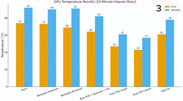实验的改造步骤很有意思,从“小打小闹”到“彻底换思路”:先是给背板加小型散热片,核心温度降了1℃,热点降了2℃——这步的意义其实是“验证被动散热的极限”:金属背板只能把热量传导到空气中,但没有主动吹风,根本带不走热点的集中热量。然后加额外散热片和风扇,核心降到64℃,热点82℃——这时候主动散热开始起作用,但风扇+小鳍片的组合,还是没解决“热量集中”的问题。